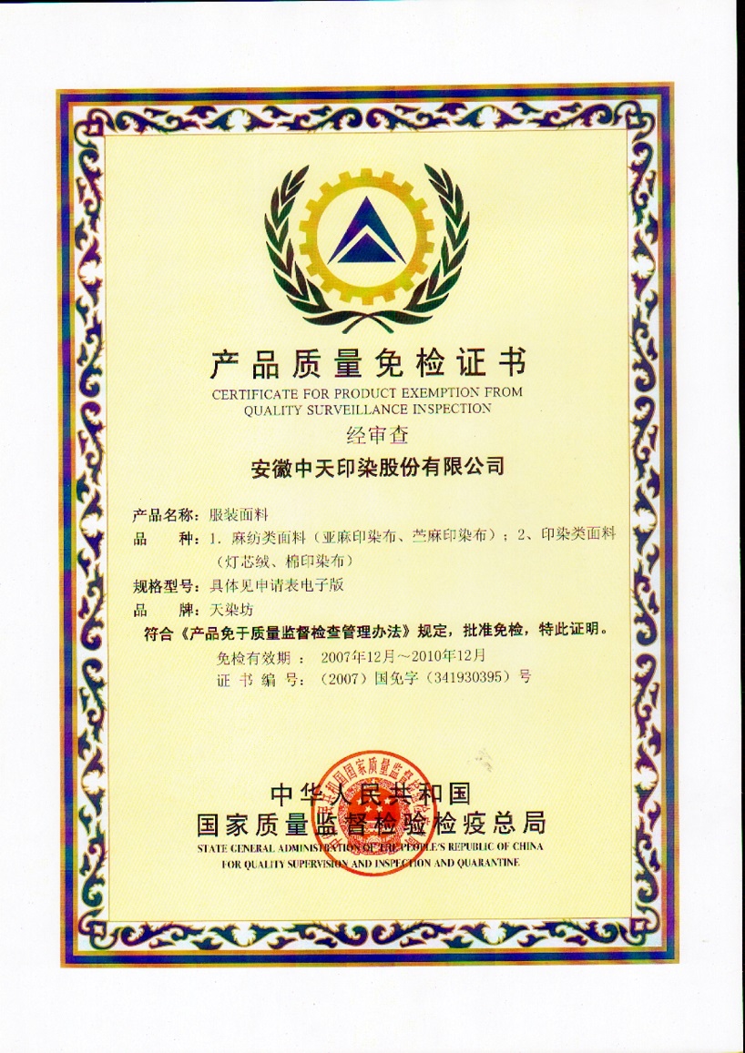 2007年榮獲產品質量免檢證書