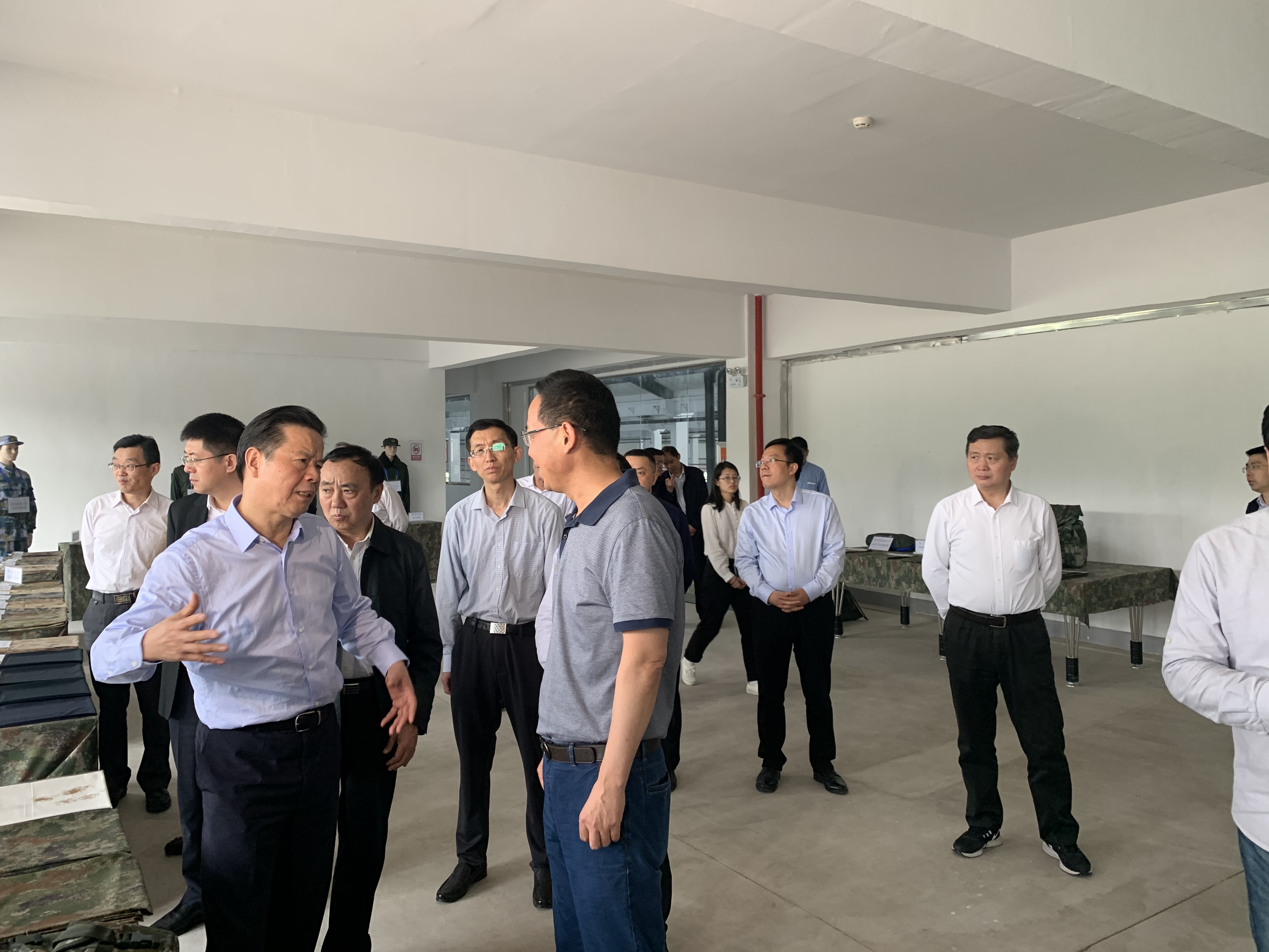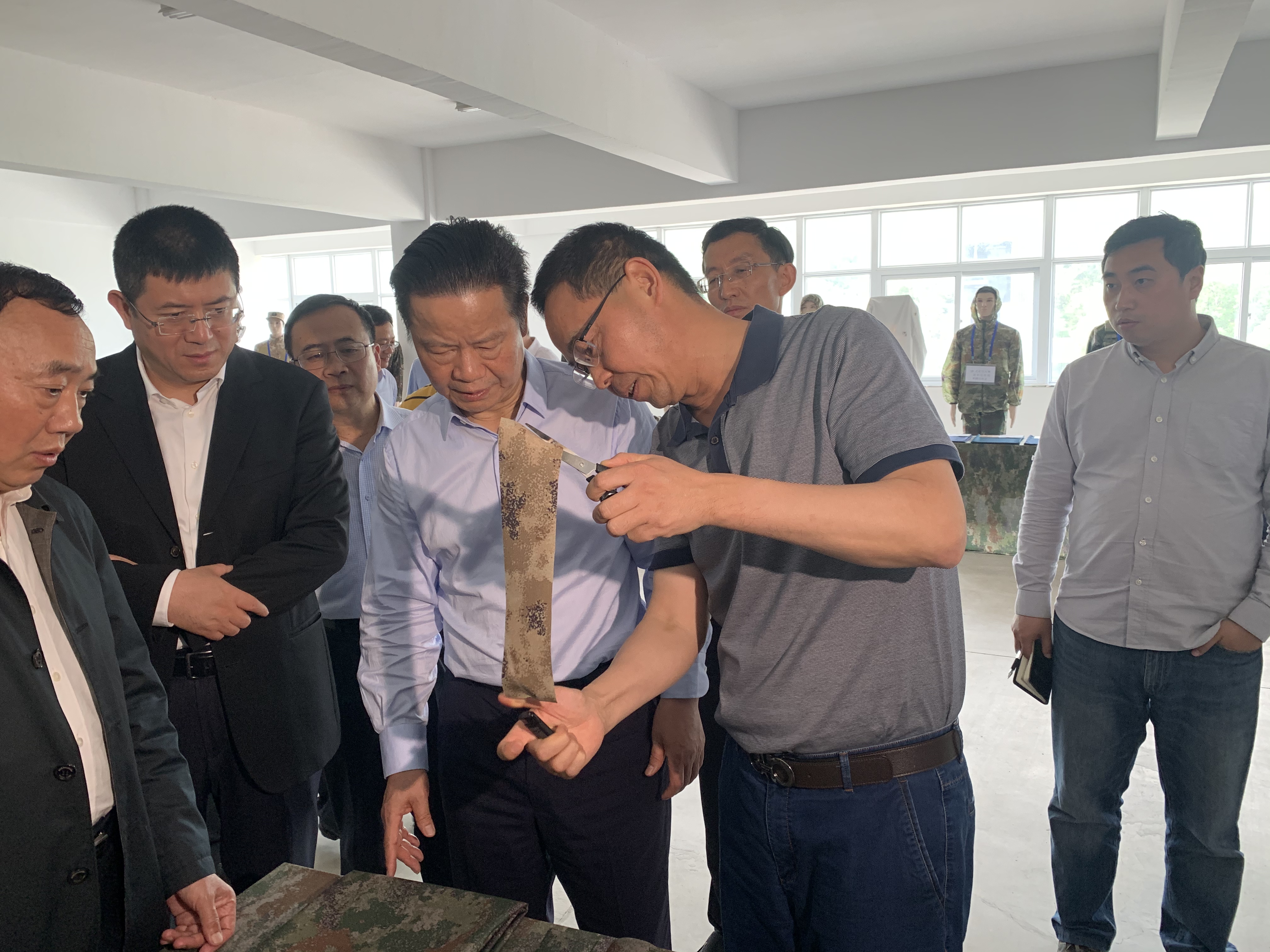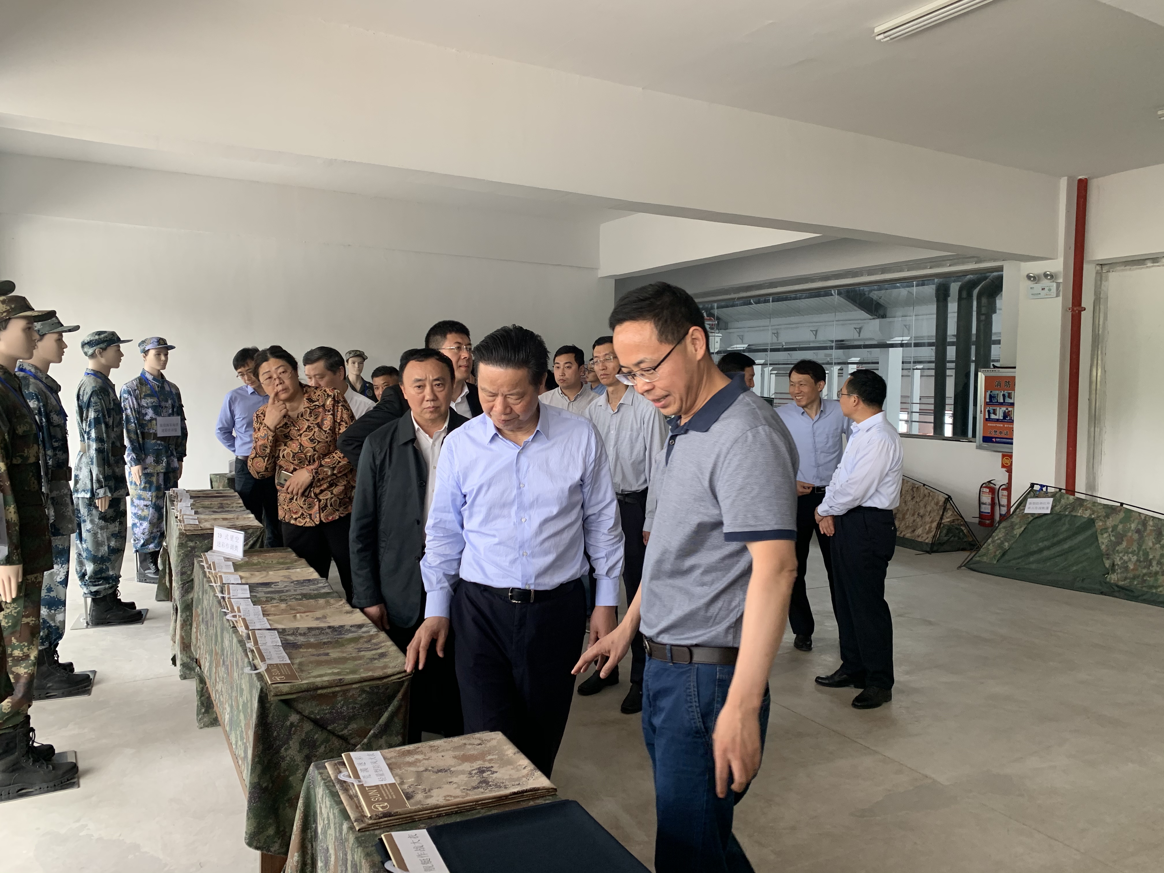 在詳細考察 “軍用裝具被裝和民用功能服裝材料產業示范項目”過程中,領導們對公司生產并即將在部隊列裝的“新型迷彩被裝材料”給予了高度的肯定與評價。
